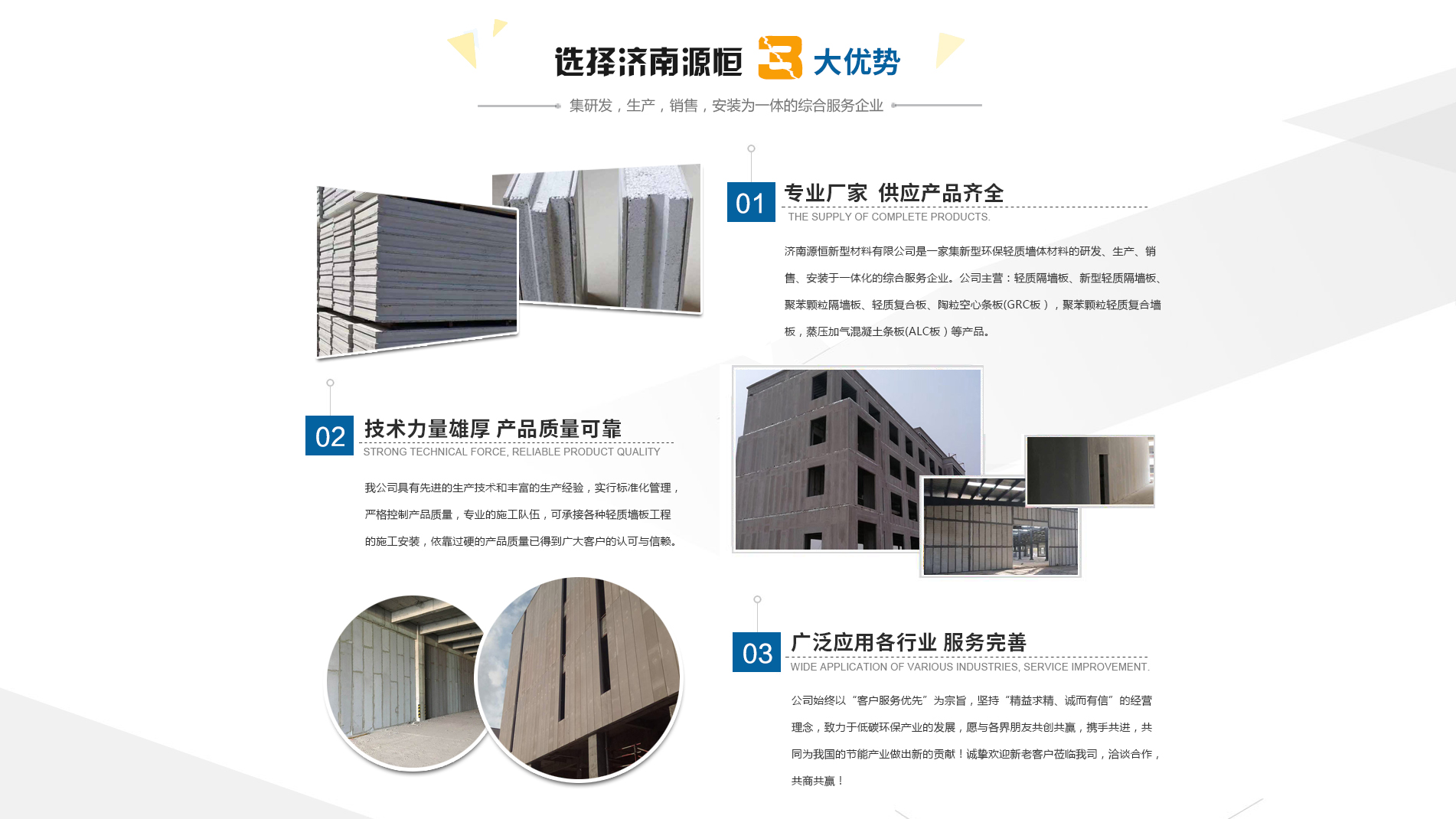 濟(jì)南源恒新型材料有限公司坐落于美麗的泉城濟(jì)南,是集新型環(huán)保輕質(zhì)墻體材料的研發(fā)、生產(chǎn)、銷(xiāo)售、安裝于一體化的綜合服務(wù)企業(yè)。我公司具有的生產(chǎn)技術(shù)和豐富的生產(chǎn)經(jīng)驗(yàn),為您提供輕質(zhì)隔墻板、新型輕質(zhì)隔墻板、聚苯顆粒隔墻板、輕質(zhì)復(fù)合板、陶??招臈l板(GRC板),聚苯顆粒輕質(zhì)復(fù)合墻板,蒸壓加氣混凝土條板(ALC板)等產(chǎn)品,本公司有專(zhuān)的施工隊(duì)伍,可承接各種輕質(zhì)墻板工程的施工安裝。輕質(zhì)隔墻板是國(guó)家推廣使用的新型輕質(zhì)、綠色無(wú)害建材,是墻改節(jié)能政策大力扶持的環(huán)保節(jié)能產(chǎn)品,是發(fā)達(dá)國(guó)家普遍采用的新型墻體材料。濟(jì)南源恒新型材料有限公司實(shí)行標(biāo)準(zhǔn)化管理,嚴(yán)格控制產(chǎn)品質(zhì)量,依靠過(guò)硬的產(chǎn)品質(zhì)量已得到廣大客戶(hù)的認(rèn)可與信賴(lài)。公司產(chǎn)品遍布各大城市,與國(guó)內(nèi)多家客戶(hù)建立了良好的合作關(guān)系。公司始終以“客戶(hù)服務(wù)優(yōu)先”為宗旨,堅(jiān)持“精益求精、誠(chéng)而有信”的經(jīng)營(yíng)理念,致力于低碳環(huán)保產(chǎn)業(yè)的發(fā)展,愿與各界朋友共創(chuàng)共贏,攜手共進(jìn),共同為我國(guó)的節(jié)能產(chǎn)業(yè)做出新的...